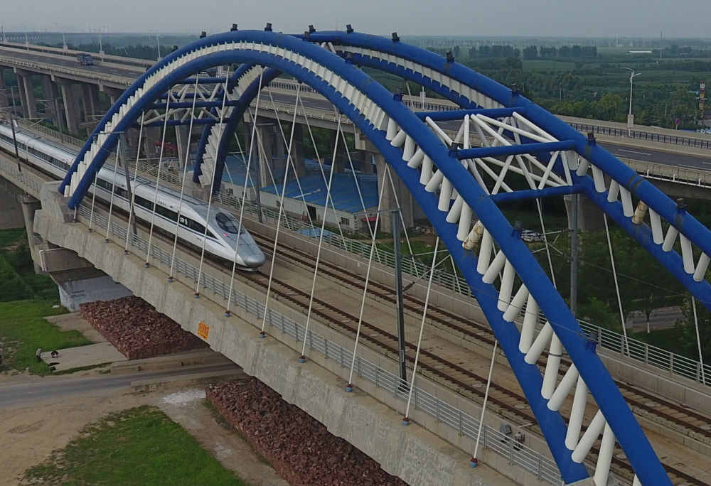↑一列动车组列车驶过京广高铁黄河大桥(2017年8月17日摄)。新华社记者 李安 摄
