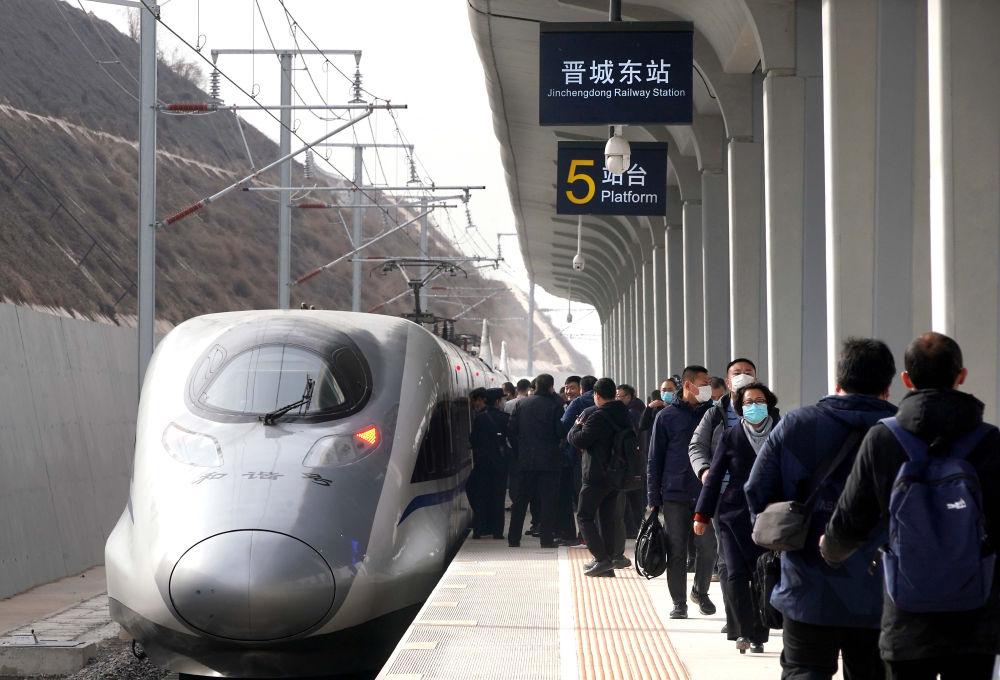 ↑2020年12月12日,从太原南站开往郑州站的D4665次列车停靠在晋城东站。当日,郑太高铁正式开通运营。新华社记者 李安 摄