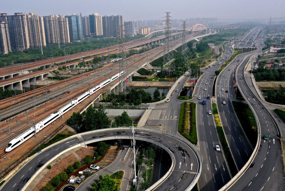 ↑4月29日,G55304次试验列车驶出郑州东站,济郑高铁濮郑段正式进入运行试验阶段(无人机照片)。新华社记者 李安 摄