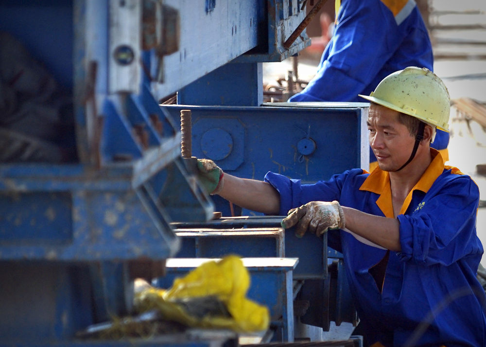 ↑施工人员在郑阜高铁先开段跨商周高速连续梁施工现场作业(2017年8月15日摄)。新华社记者 李安 摄