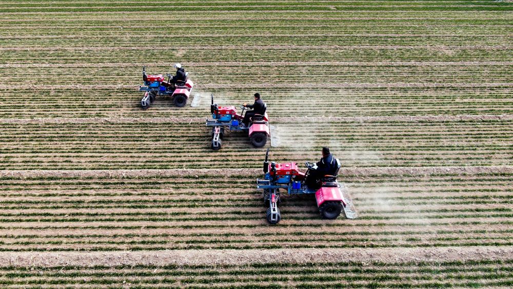 2月17日,在山东省聊城市莘县妹冢镇,农民在麦田里进行镇压保墒作业。新华社记者郭绪雷 摄