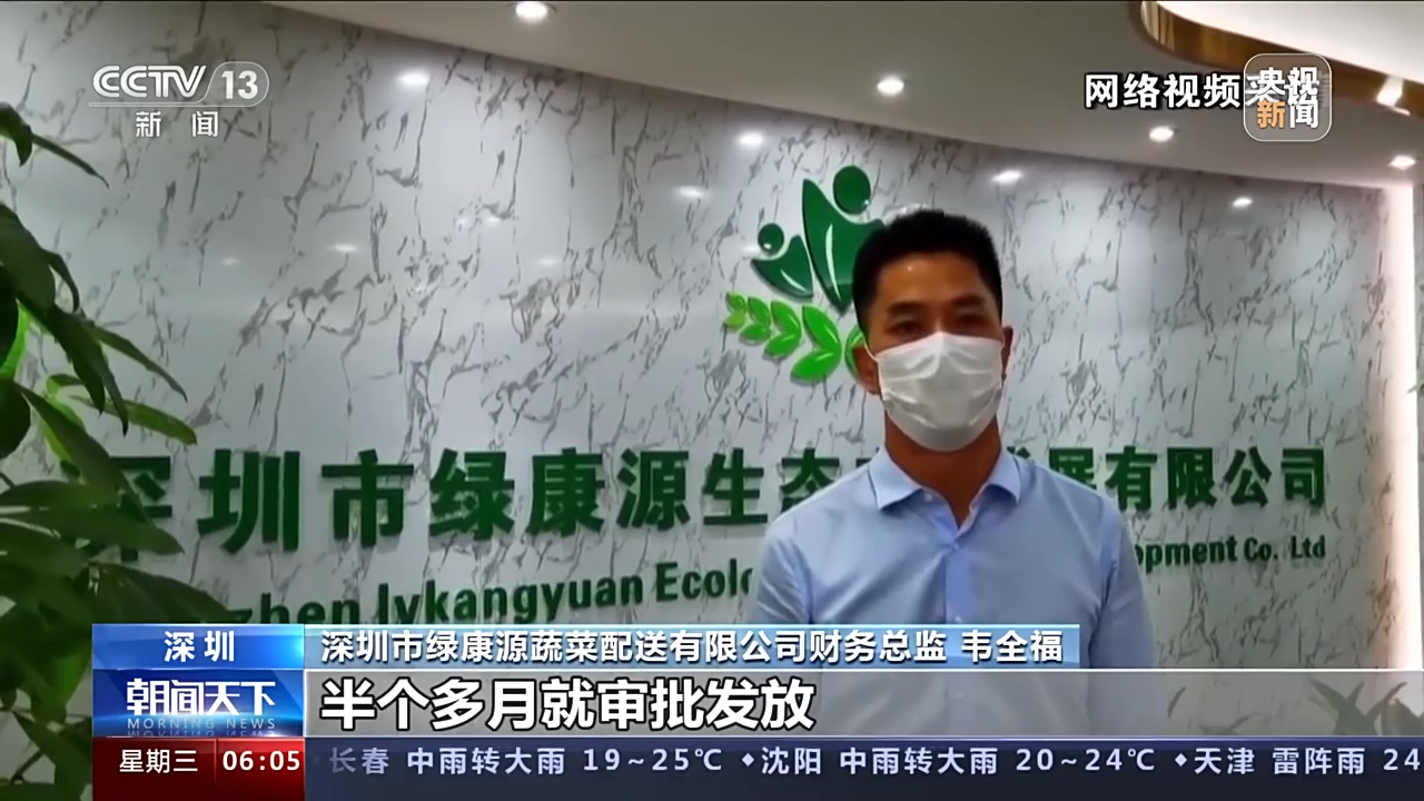 深圳市绿康源蔬菜配送有限公司财务总监 韦全福:半个多月就审批发放,这笔钱对我们来说就是“及时雨”,不仅缓解了我们的现金流的压力,还有力支持我们公司扩大经营规模。