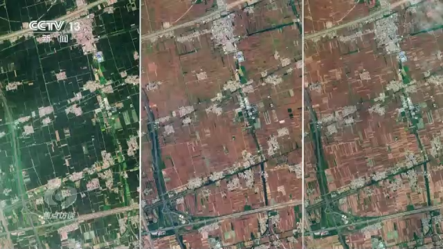 让我们从太空视角,看看“中原粮仓”河南的夏收。麦田里的联合收割机来回穿梭,收割完的麦田变成了土黄色,收割机身后留下了一排排整齐的麦茬,这是地球给太空展示的丰收画卷。