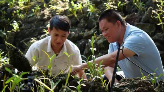 施茶村党委书记洪义乾(右)查看火山石斛长势。受访者供图