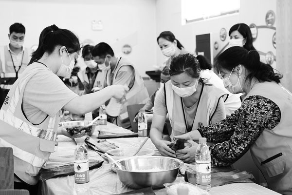 波罗粽制作技艺代表性传承人陈玉彩和建筑工人一起包粽子 广州市文化馆供图