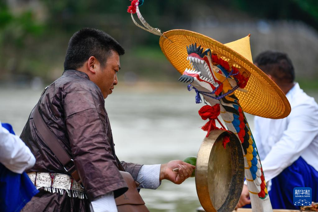 6月23日,苗族群众在贵州省台江县施洞镇清水江上赛独木龙舟时敲锣。