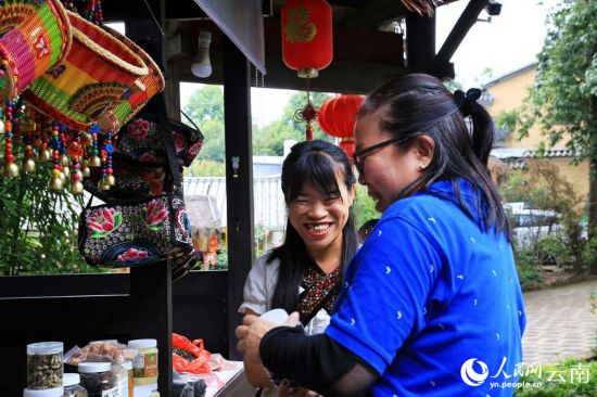 赵仁芹(左)热情地向游客介绍着自家的特色农产品。人民网 刘怡摄