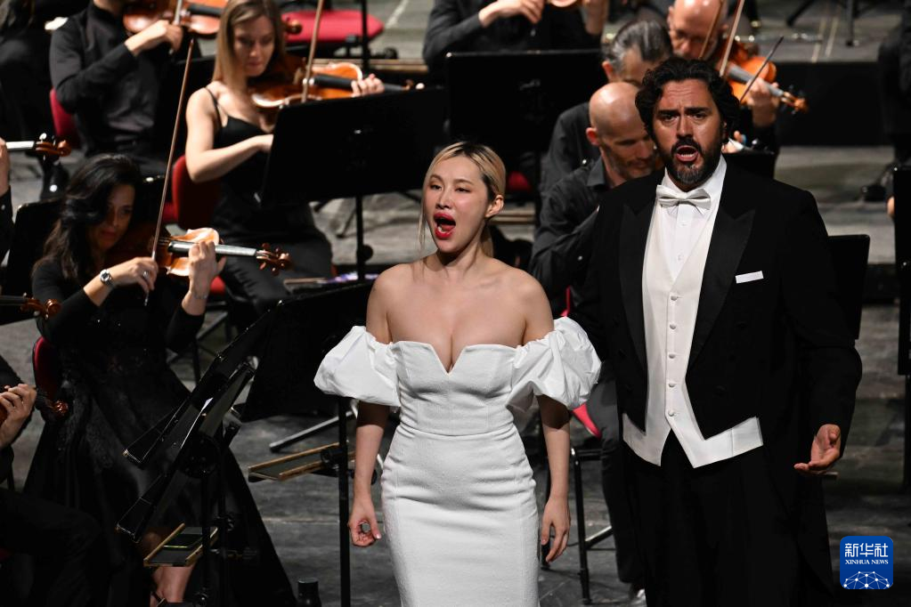 6月25日,在意大利罗马歌剧院,旅意华人女高音王冰冰(前左)和意大利男高音詹卢卡·夏尔佩莱蒂(前右)合作演唱。