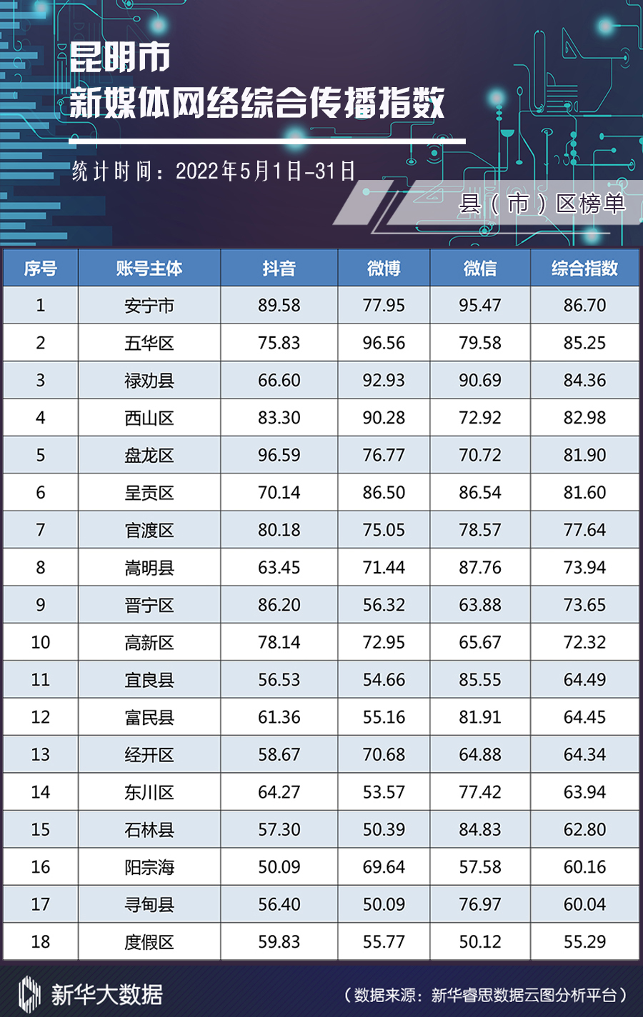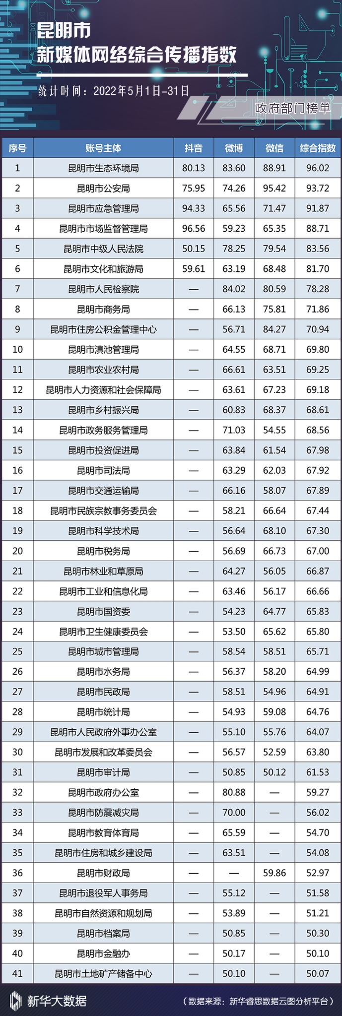 新华网昆明6月27日电(刘奕)日前,2022年5月昆明市新媒体网络综合传播指数榜单(以下简称“榜单”)发布。在“党群部门”榜单中,新增昆明市纪委监委、共青团昆明市委抖音数据。