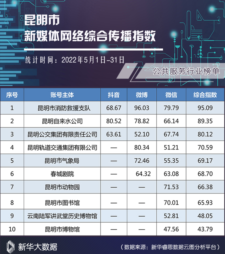 在榜单中,昆明自来水公司抖音数据排名首位,8条作品获赞8271次、分享457次、评论442条。在微博平台的7个指标中,昆明市消防救援支队在月度发文、原创博文、月度评论、月度转发、月度获赞5项指标中继续排名第一。在微信平台中,昆明市消防救援支队月度阅读量近5万次。