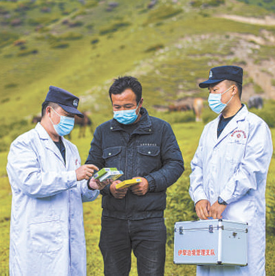 新疆伊犁边境管理支队民警为牧民送药并讲解使用方法。王 帅摄(影像中国)