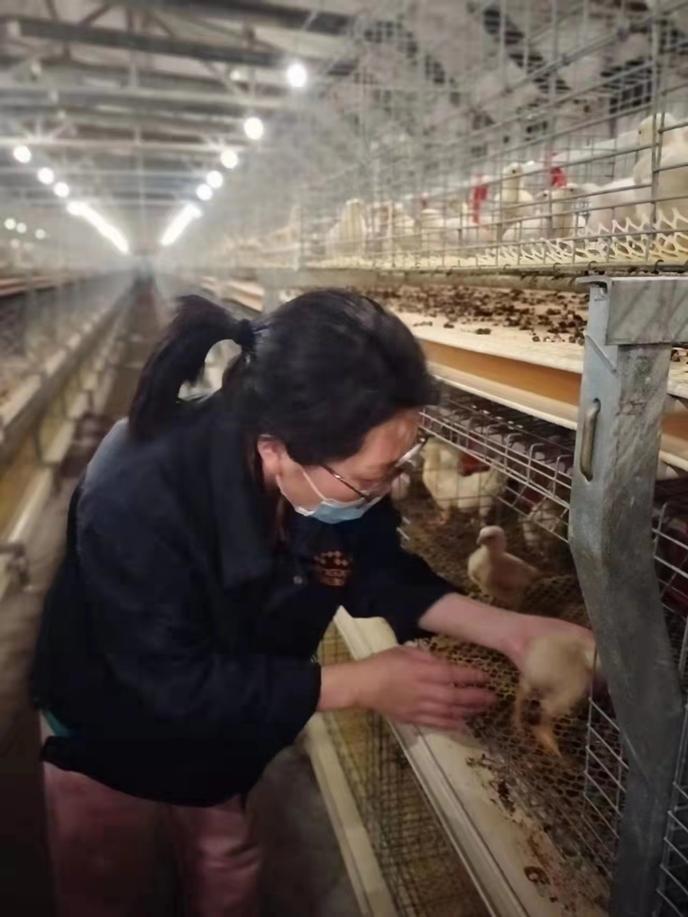 养殖户李懿洋在标准化鸡舍内检查鸡雏长势。起点白羽鸡养殖专业合作社供图