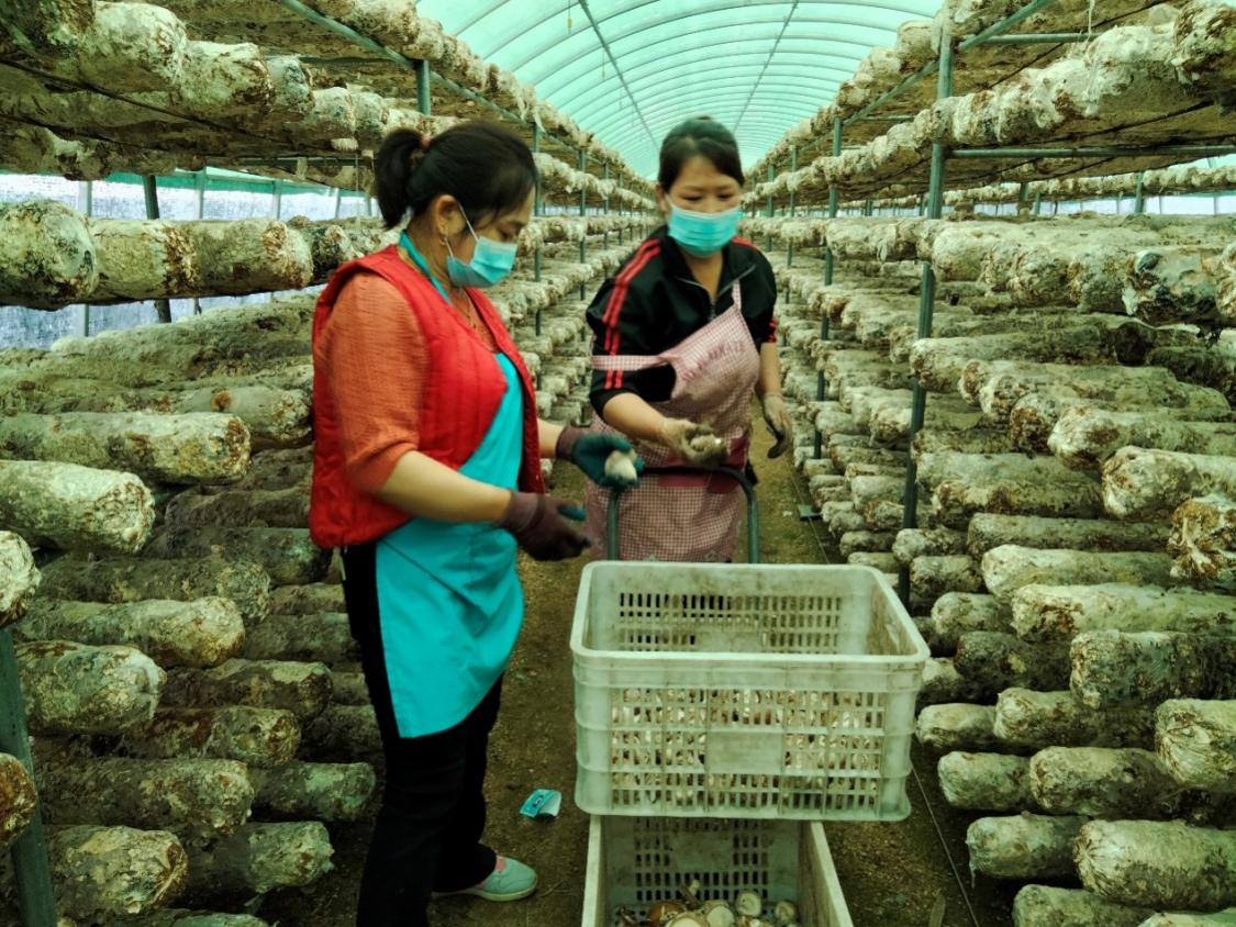 牧牛镇香菇种植户在食用菌大棚内采摘香菇。岫岩县委宣传部供图