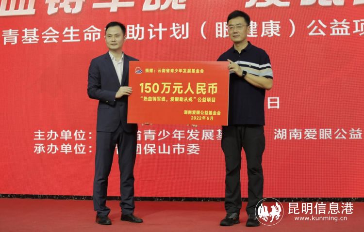 昆明信息港讯 记者昝娟娟 6月29日,由云南省青少年发展基金会发起的“热血铸军魂·爱眼助从戎”公益项目在云南保山启动。启动仪式上,由湖南爱眼基金会向云南省青少年发展基金会捐款150万元,用于帮助有志于参军入警的青年进行近视治疗。