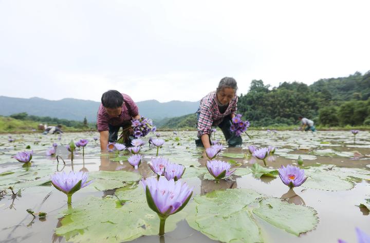 2022年6月28日,在贵州省赤水市宝源乡玉丰村,村民在采摘香水莲花。近年来,贵州省赤水市宝源乡采取“党支部+合作社+农户”模式,引导农民种植集观赏、药用、食用为一体的香水莲花,带动农民增收,助力乡村振兴。新华社发(王长育/摄)