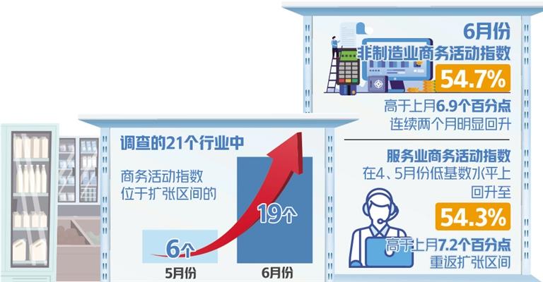 最新数据显示,进入6月份,随着企业复工复产有序推进,服务业生产指数下行势头减缓,部分接触性服务业降幅收窄明显。中国物流与采购联合会和国家统计局服务业调查中心发布的最新数据显示,6月份服务业业务活动预期指数为61%,比上月上升5.8个百分点。