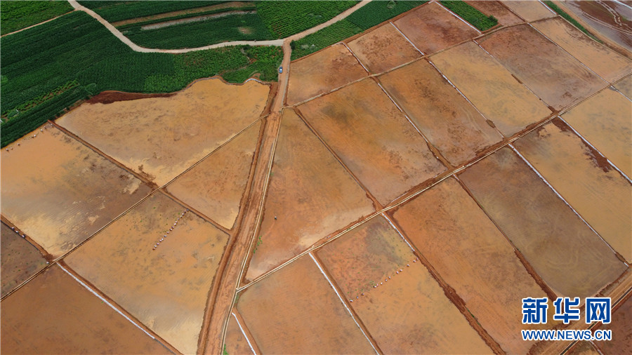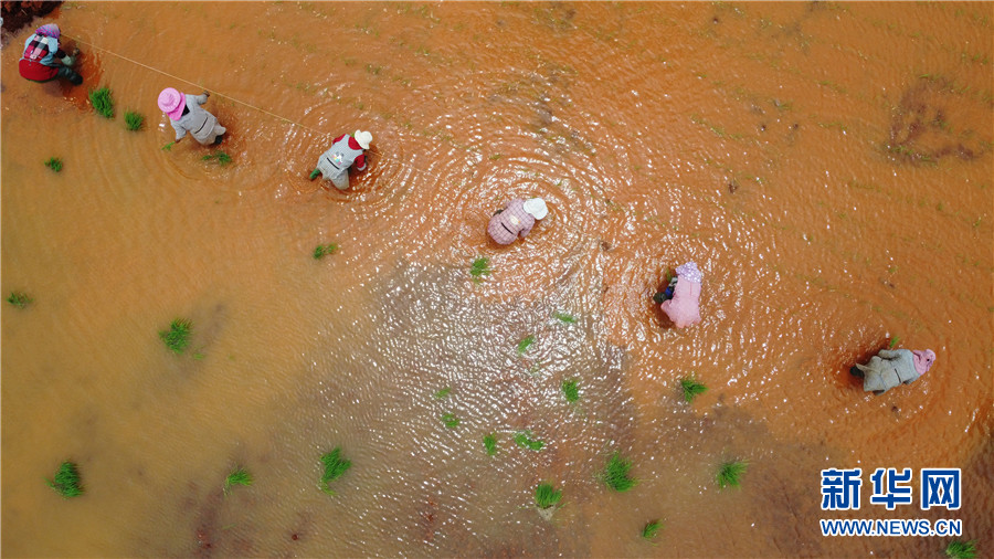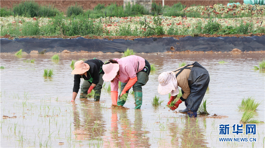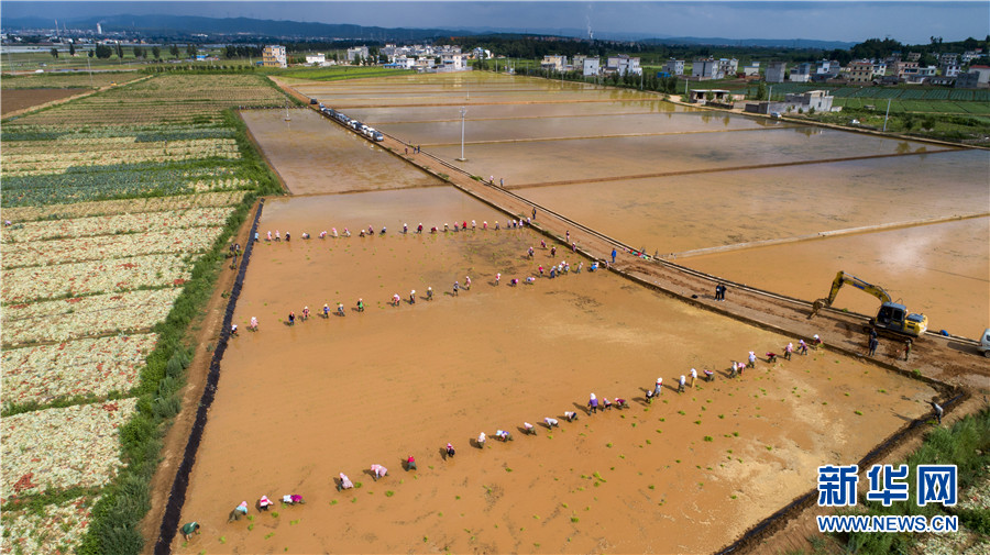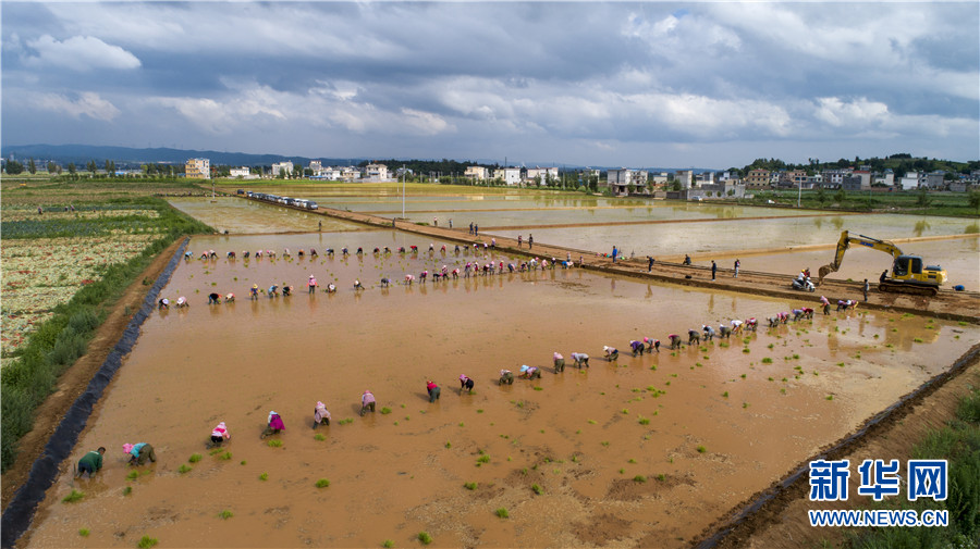 云南省曲靖市沾益区盘江镇谭家营村,农民在田间插秧(6月9日摄)。新华网发(段汝立 摄)