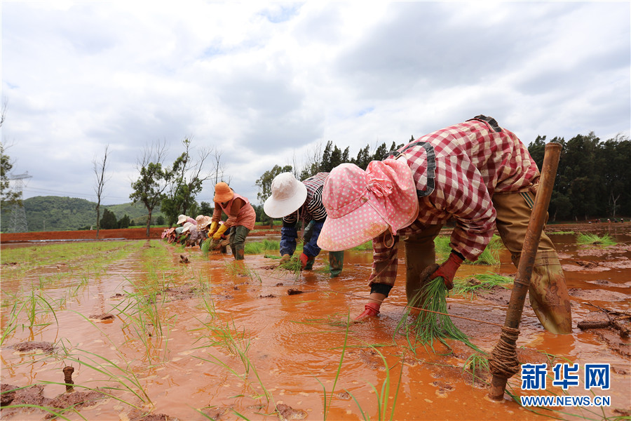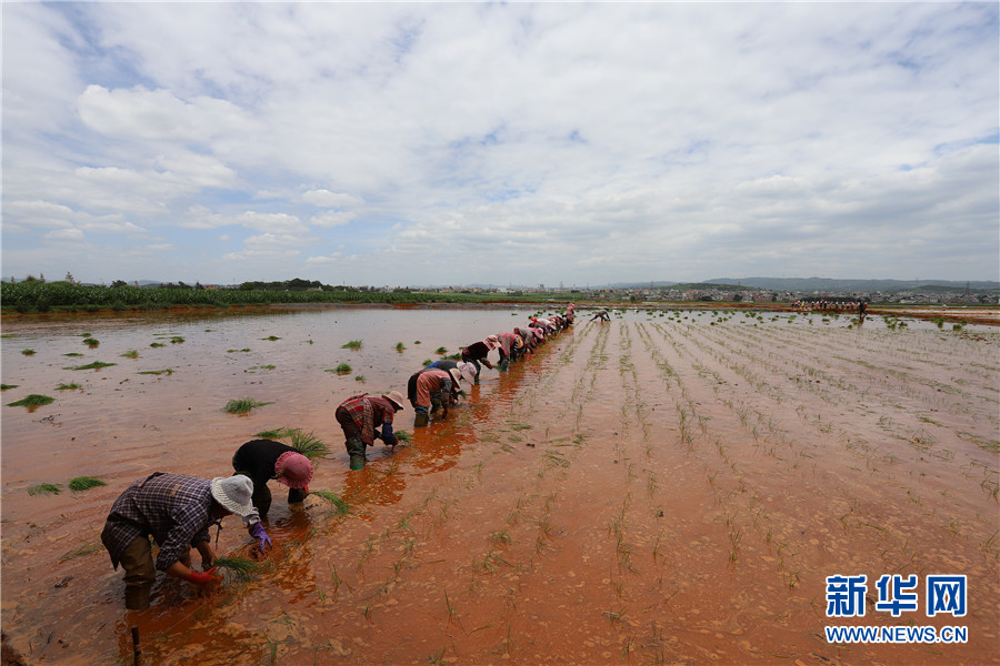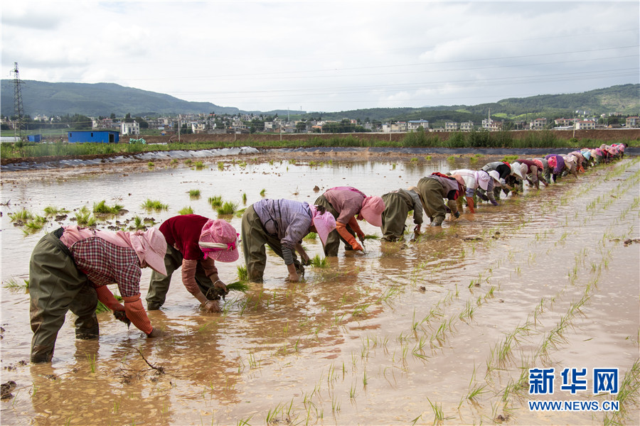 云南省曲靖市沾益区盘江镇谭家营村,农民在田间插秧(6月9日摄)。新华网发(吴佳勇 摄)