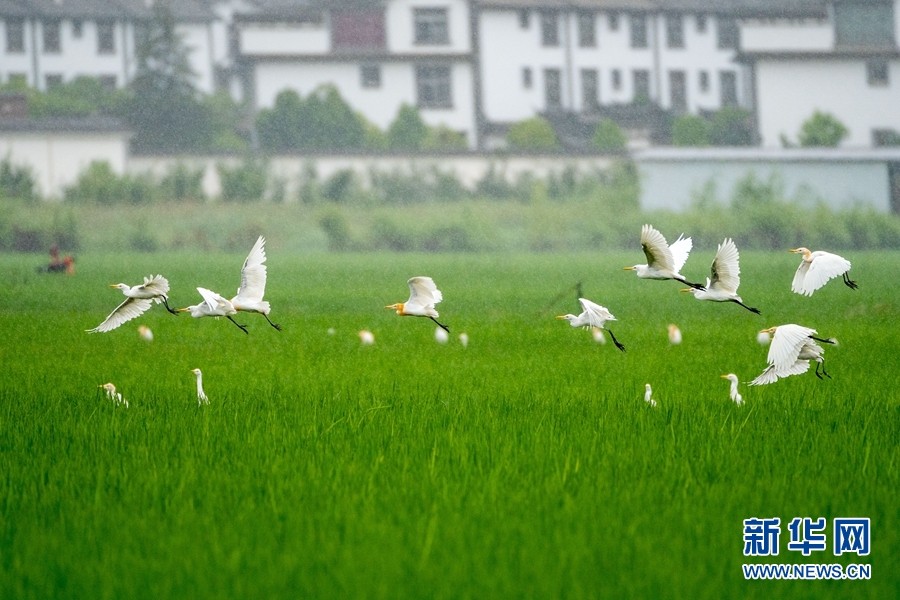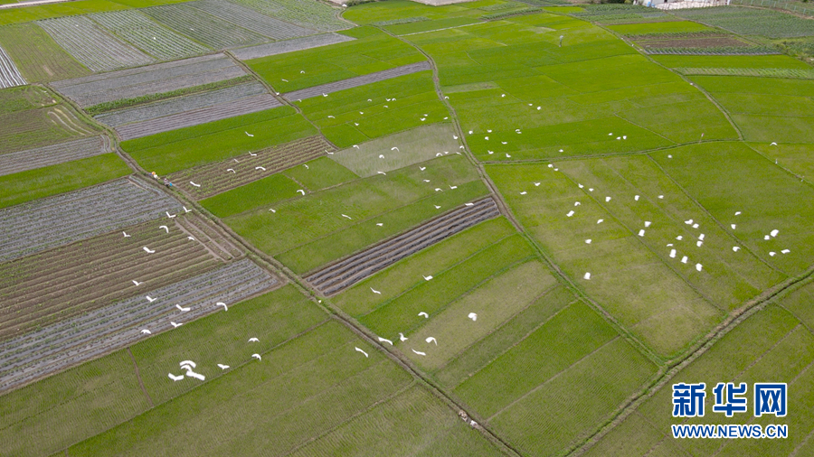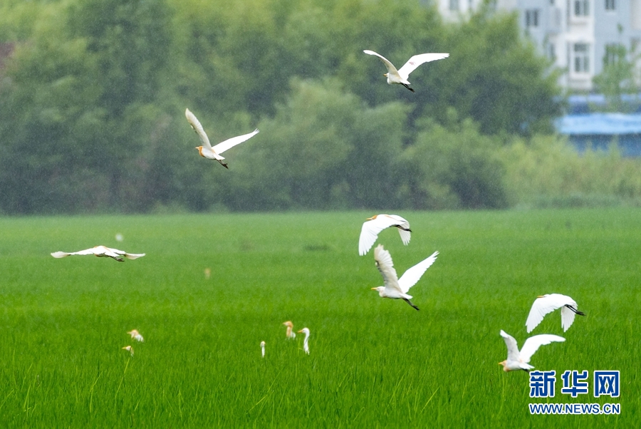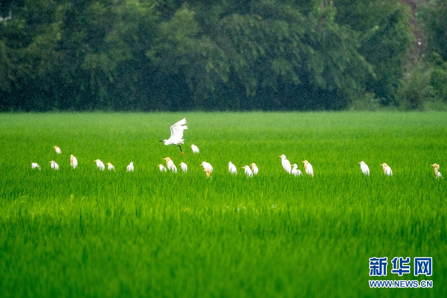仲夏时节,云南省大理白族自治州洱源县,碧绿的稻田里,来了一群“小精灵”,以白鹭、牛背鹭为主的各类鹭鸟,成群结队,或在田野上空自由飞翔,或在稻田里悠然觅食,一派“漠漠水田飞白鹭”的恬静景象。据悉,近年来,洱源县统筹山水林田湖系统治理,持续推进生态文明建设,山变绿了,水变清了,生态环境变好了,各类鹭鸟的数量也逐年增加。