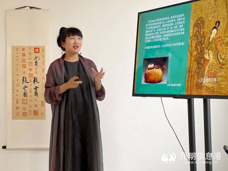 王迎新女士以多年的实践来简述中国茶的习俗、发展历史,从留存的古代书画向大家讲解古代茶席、茶器的样貌,并通过自身多年实践的人文茶道,带来生动的茶器文化、饮茶文化等知识,其中还讲到宋代的点茶。由于分享时间有限,大家听得意犹未尽,抱怨称,感觉刚刚才讲到唐宋,怎么这么快就到明清了?王迎新女士出生于云南普洱茶文化世家,对茶器有着特殊的情感,一壶一盏在她眼里都是宝贝,每次携带出场,均搭配适宜的花束作为装饰,由此可见茶器在她心中的分量。