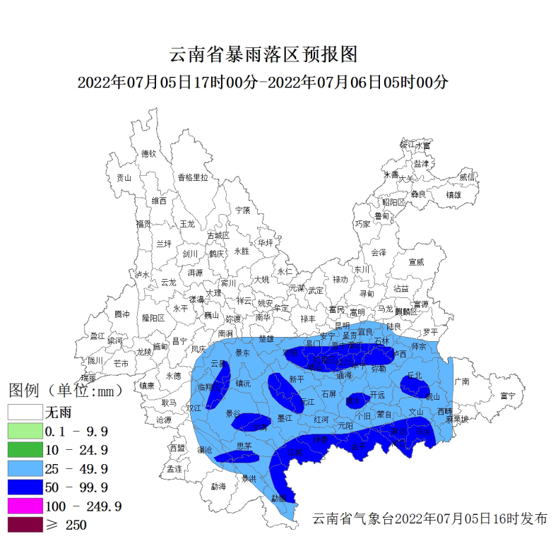 云南省气象台2022年7月5日17时发布暴雨蓝色预警:过去12小时,昆明南部、楚雄南部、玉溪、红河、文山西部和南部、普洱、临沧东部、西双版纳局地已经出现大到暴雨,预计未来12小时,上述地区强降水仍将持续,且范围进一步扩大,有暴雨局地大暴雨,请有关单位和人员做好防范准备。