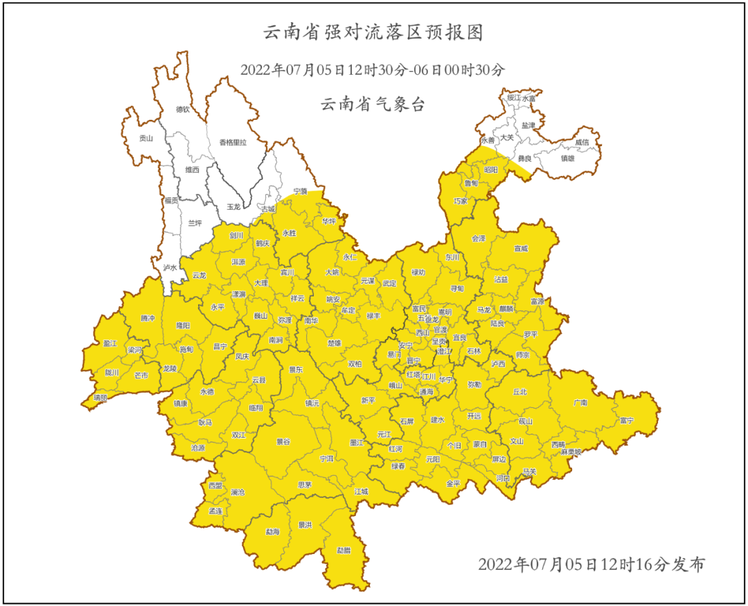 云南省气象台2022年7月5日12时30分继续发布强对流黄色预警:预计未来12小时,昭通南部、曲靖、昆明、楚雄、大理、丽江南部、保山、德宏、临沧、普洱、西双版纳、玉溪、红河、文山将出现雷电,并伴有短时强降水、局地冰雹、大风等强对流天气,请注意防范。