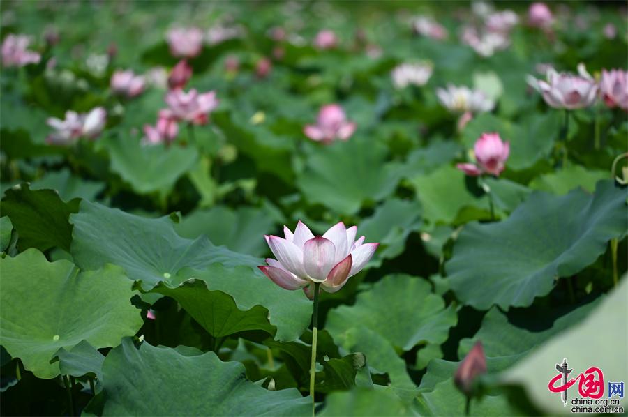 眼下正是荷花盛开的季节,湖南省新邵县白水洞景区的百亩荷花基地里,荷花竞相绽放,满目碧绿的荷叶挨挨挤挤,星星点点的荷花嫣然摇动,红绿相倚。