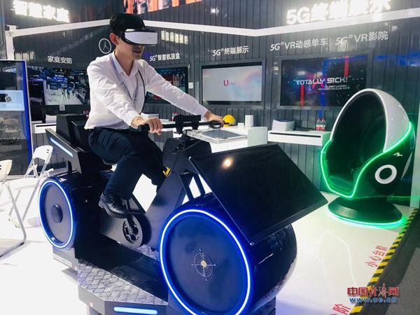 第四届数字中国建设峰会上,一名观众在体验基于5G技术的VR动感单车。 (中国经济网记者王婉莹/摄 资料图)
