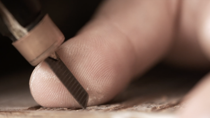 在雕版环节中,右手握刀,左手顶住刀背,经过发刀和挑刀两道工序之后,汉字逐渐成型。