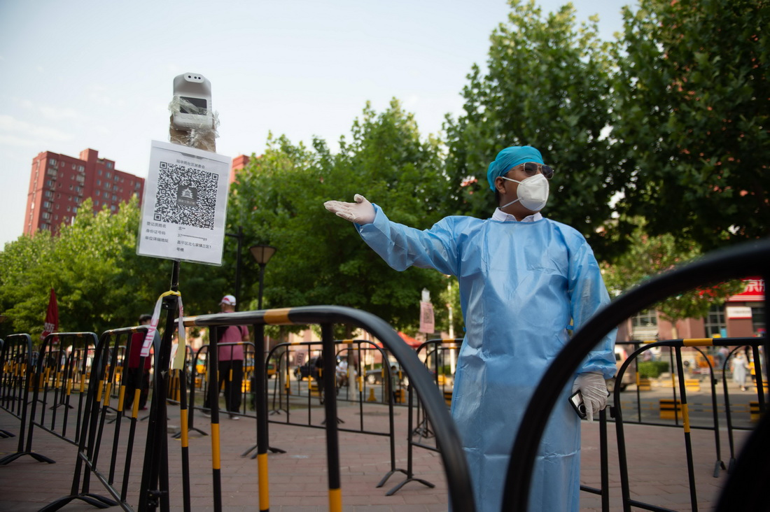 6月3日,张旭在冠华苑社区核酸采样点维持现场秩序。新华社记者 陈忠昊/摄