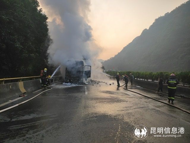 昆明信息港讯 记者劳学丽 7月8日,一辆大货车在昆石高速上因车头自然引发起火,昆明宜良县消防救援大队在接到报警后十三分钟就赶到现场,在经过近一个小时的奋战后将大火扑灭。