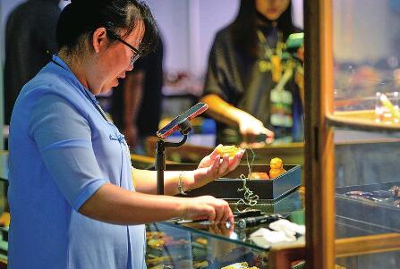 另一边的红玉展台,老板通过专业的工具向顾客展示玉料、加工方式等。一旁的翠玉缘珠宝展台前,顾客络绎不绝,有市民一次性购入9件玉石饰品。