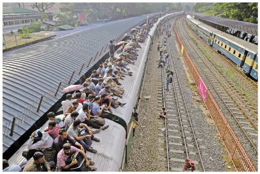 7月7日,在孟加拉国首都达卡的火车站,列车车顶坐满了返乡的人们。随着宰牲节临近,孟加拉国首都达卡在节日前迎来了返乡潮。