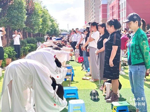 书香校园内,毕业礼现场一片欢腾,恍若时代穿越。六年级的孩子们精心打扮,身着各式国风服饰,端庄大方,衣袂飘飘,在风雅音乐中将中国传统礼仪陆续演绎。