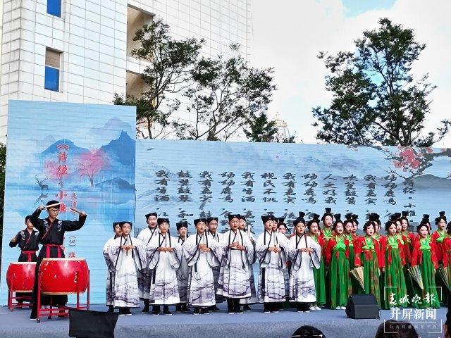 诗词朗诵巩固传统文化之根,毕业班孩子以《诗经》中多个经典篇目或改编表演,或深情吟诵,如《国风·卫风·木瓜》《国风·秦风·无衣》等,涉及反映传统美德、社会风貌、爱国情怀等多方面的主题,传承国学精髓。