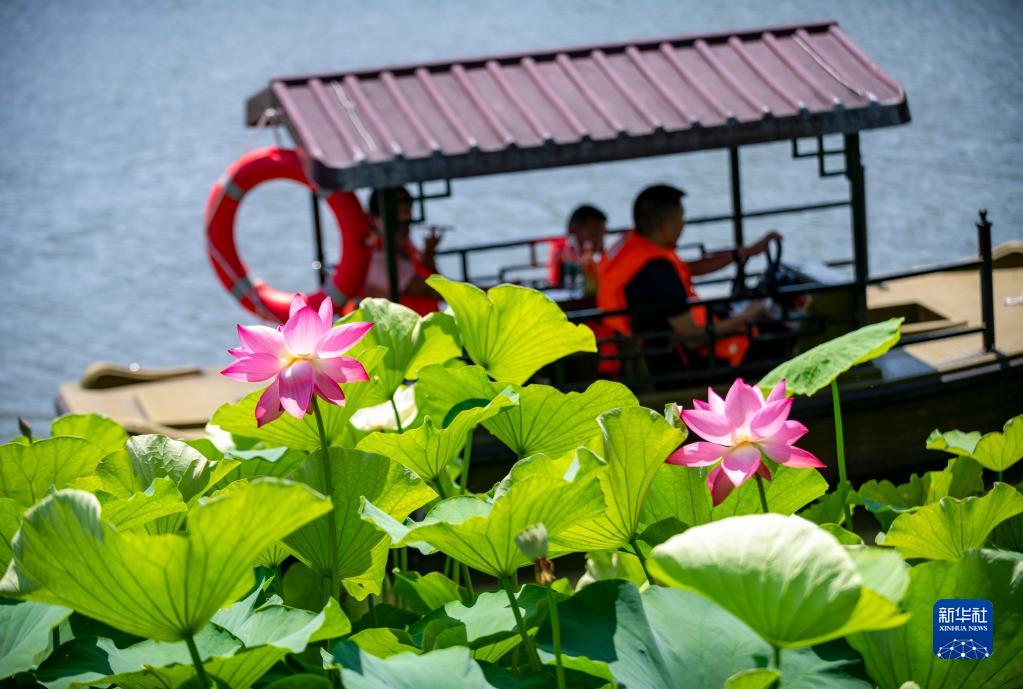 7月6日,载着游客的船从大观公园盛开的荷花旁经过。 新华社记者 陈欣波 摄