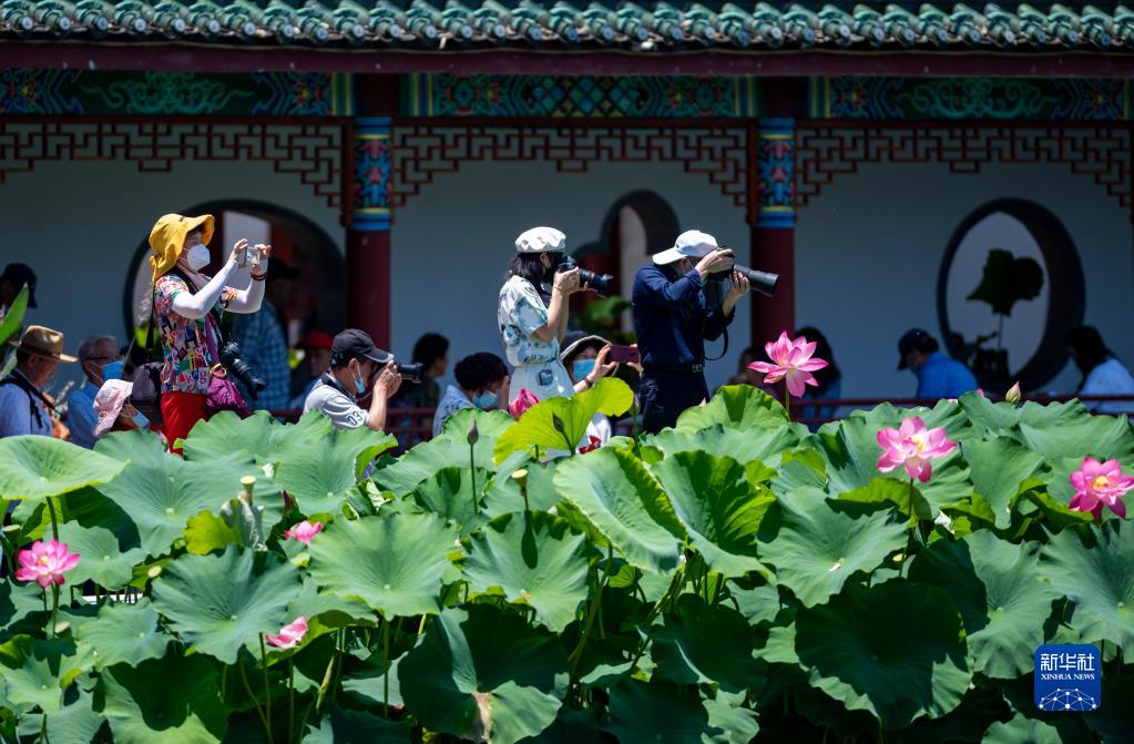 7月6日,游客在昆明大观公园拍摄荷花。 新华社记者 陈欣波 摄
