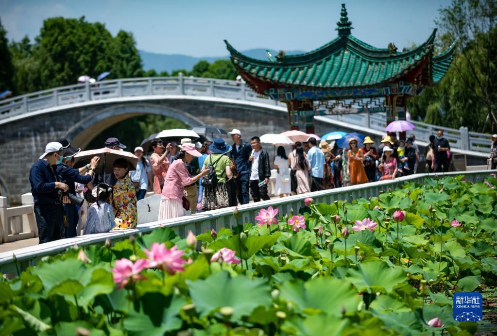 7月6日,游客来到昆明大观公园欣赏荷花。 新华社记者 陈欣波 摄