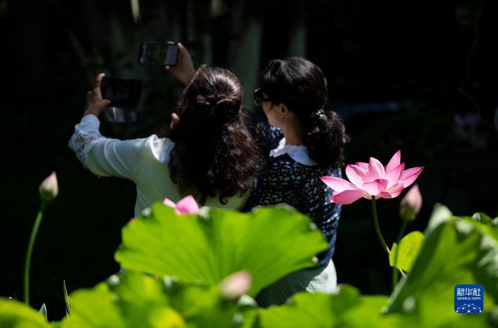 7月6日,游客在大观公园内与盛开的荷花自拍合影。 新华社记者 陈欣波 摄