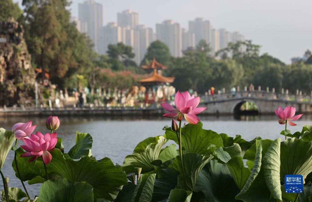 这是7月6日在昆明大观公园内拍摄的荷花。 新华社记者 陈欣波 摄