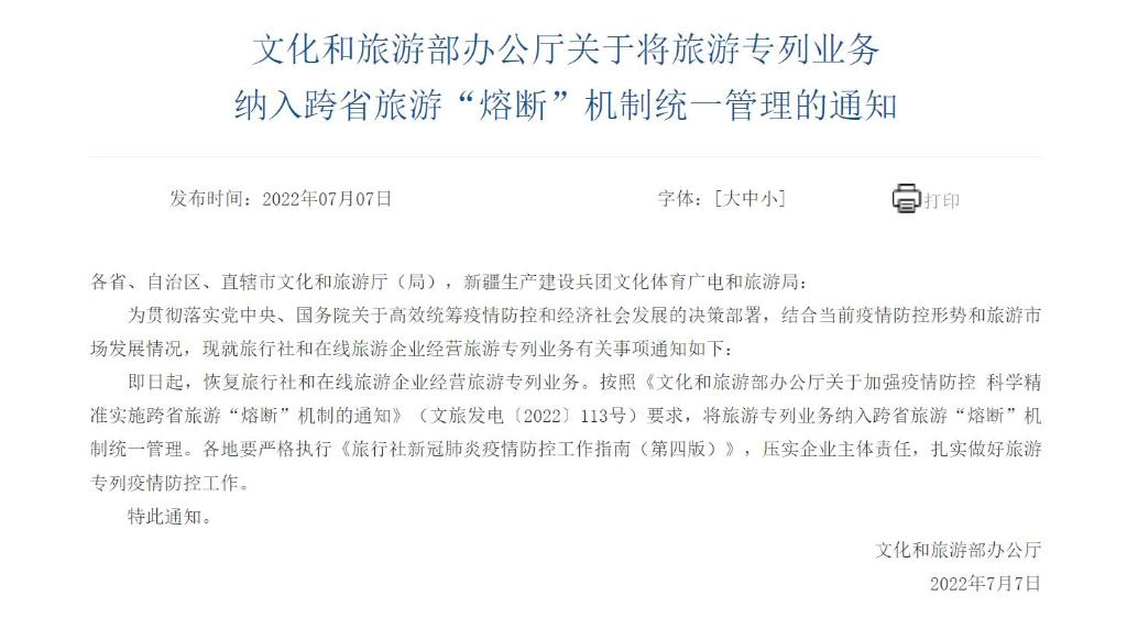 文化和旅游部办公厅7月7日发布通知要求,即日起,恢复旅行社和在线旅游企业经营旅游专列业务;按照相关规定,将旅游专列业务纳入跨省旅游“熔断”机制统一管理。