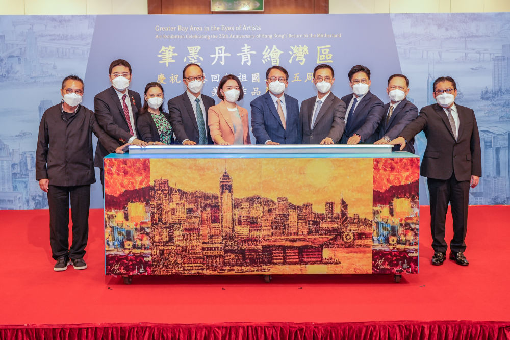 7月9日,“笔墨丹青绘湾区——庆祝香港回归祖国25周年美术作品展”在香港中央图书馆启动。展览共展出116件美术精品,旨在借助内地及港澳美术家们的画笔,记录描绘粤港澳大湾区创新实践,展望香港美好未来。新华社发