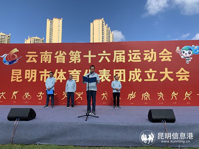 成立大会上,昆明市副市长、省十六运会昆明市体育代表团团长赵波讲话。市教育体育局局长穆仁早宣读了《关于成立云南省第十六届运动会昆明市体育代表团的通知》,运动员代表和教练员代表相继宣誓。赵波向市教育体育局局长、省十六运会昆明市体育代表团副团长穆仁早授团旗。