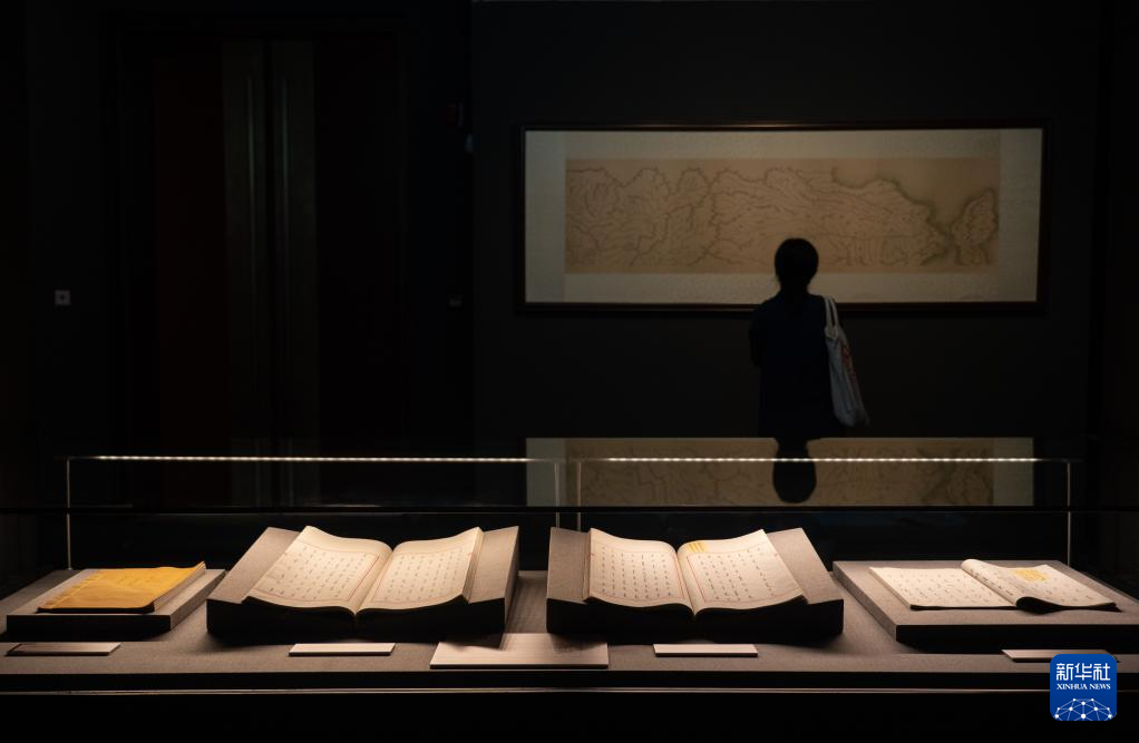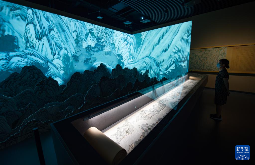 7月13日,观众在“兰台翰墨 家国春秋——明清历史档案展”上观看展品《金沙江上下两游山水全图》。 新华社记者 陈钟昊 摄