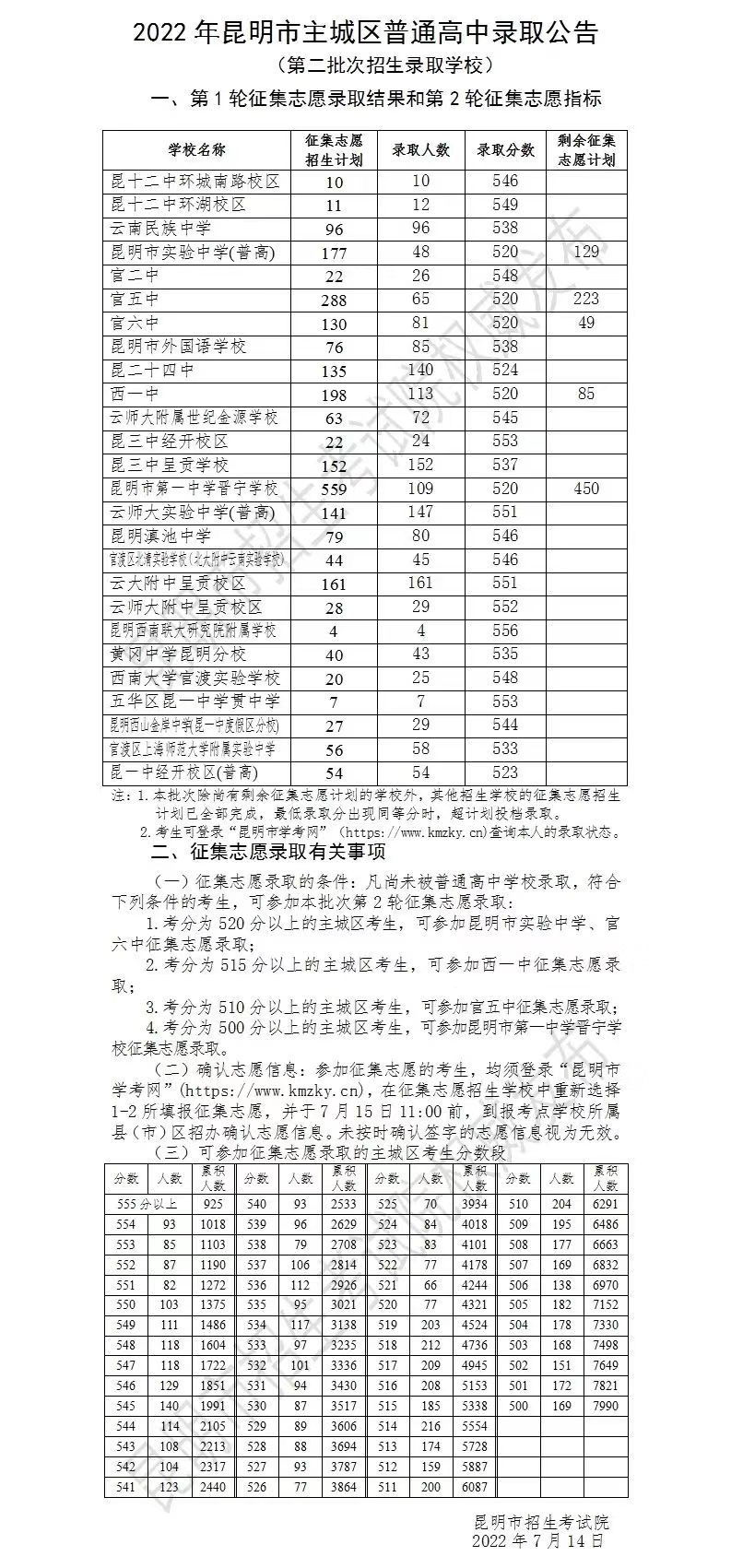 昆明信息港讯 记者上官艳君 7月14日,昆明市招生考试院发布《 2022年昆明市主城区普通高中录取公告(第二批次招生录取学校)第一轮征集志愿录取结果》。考生可登录“昆明市学考网”(www.kmzky.cn)查询本人的录取状态。