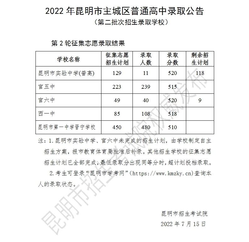 昆明信息港讯 记者上官艳君 7月15日,昆明市招生考试院发布《2022年昆明市主城区普通高中录取公告(第二批次招生录取学校)》,公布了第2轮征集志愿录取结果。
