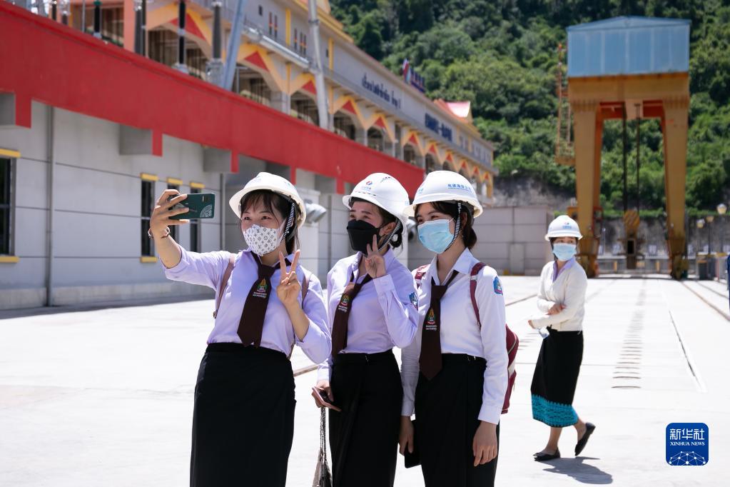 7月13日,老挝高校学生参观南欧江一级水电站。 新华社发(凯乔 摄)