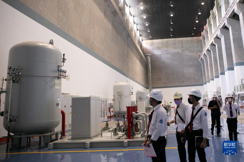 7月13日,老挝高校学生和媒体记者参观南欧江一级水电站。 新华社发(凯乔 摄)