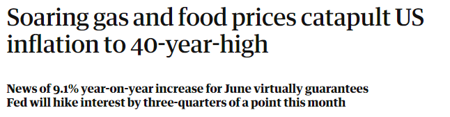 英国《卫报》网站7月13日报道称,美国6月份通货膨胀增速超出预期,主要受汽油、食品和住房价格上涨影响,通胀率出现40多年来最大的年度增幅。这一消息也基本确定,美联储(Federal Reserve)将在本月再次加息75个基点。