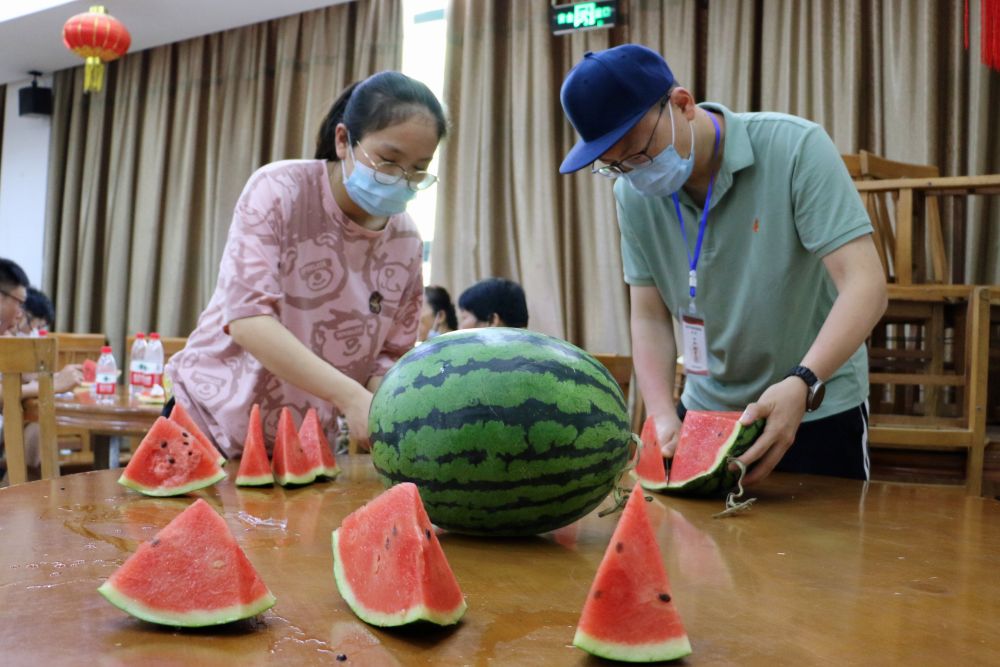 7月12日,盈丰街道工作人员在空调休息室为大家准备西瓜解暑。新华社记者 王聿昊 摄
